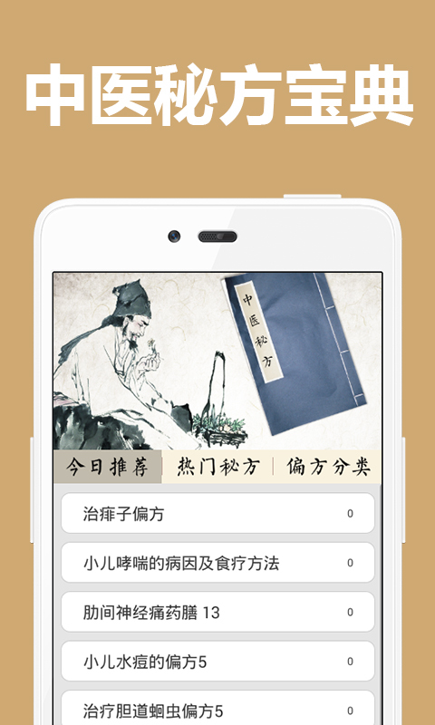 《中医秘方宝典》是一款手机医疗秘方资讯软件,中医秘方宝典是专业中医人士进行数据筛选而集成的中医偏方秘方宝典,具有上千种中华医术和民间广为流传的偏方秘方。