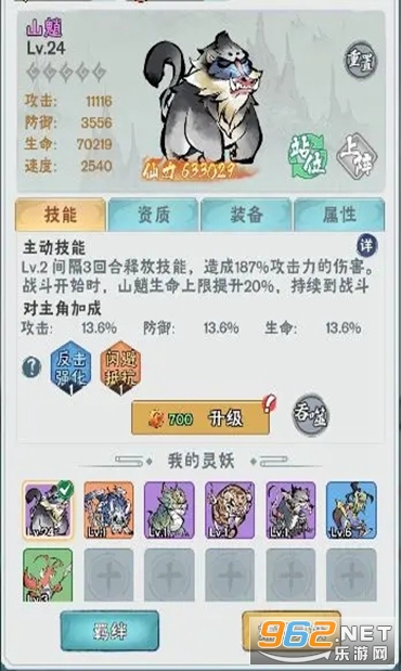 灵妖可以协助角色战斗,在战斗中释放参战技能,可以通过降伏获取灵妖,降伏灵妖时随机获取灵妖被动技能。消耗妖丹 可以提升灵妖等级。