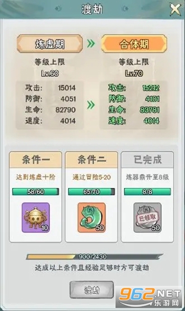 每当道友完成渡劫任务并获得足够的经验即可进行渡劫,提高角色属性,还会改变角色外貌;