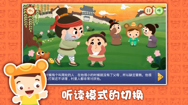 《周处悔改app》是一款国学主题的幼儿教育类软件,主要教小朋友学习三字经的内容,周处悔改就是三字经中的第一个小故事,游戏采用Q萌的画风,可爱的叙述方式,让小朋友在听故事的过程中接受潜移默化的教育,学习知识。