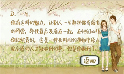 《测你会被暗恋多久app》是一款小清新手绘画风的情感测验类休闲娱乐手游,正如游戏名称一样,就是根据你的实际情况做一些选择,测试你的情感倾向,用来娱乐自我,准不准就另说了哦。