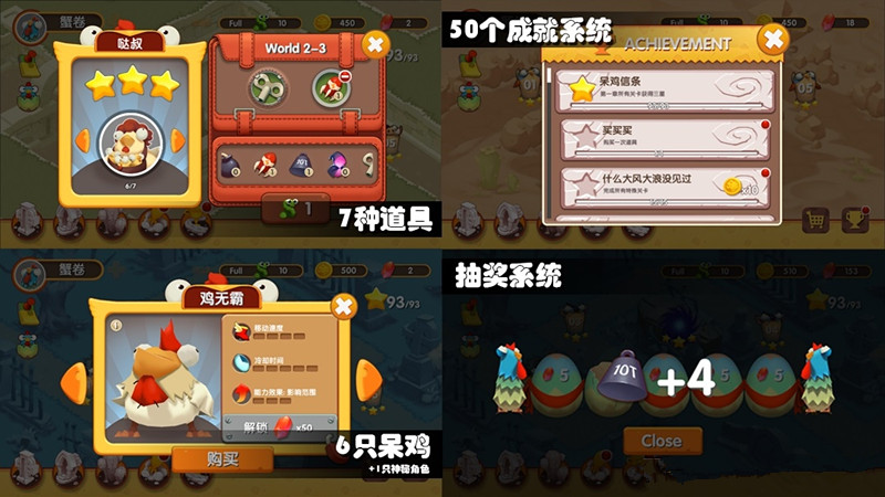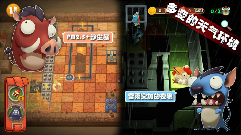 游戏采用俯视角3D画面,略显夸张的卡通造型让各种小动物们都显得十分有趣,精心设计的丰富关卡可玩性极强,同时还有成就系统和众多解锁道具,角色等你来玩。