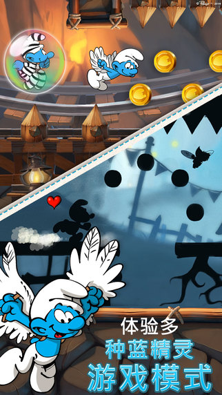 在蓝精灵的世界里随处极限跑酷,有村庄、森林、矿藏,还有格格巫的城堡!