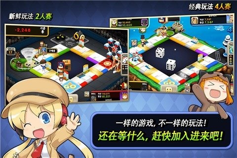 经典大富翁再度来袭!全明星大富翁以传统大富翁休闲棋为核心加入大量创新元素与小游戏玩法,玩家可以在手机上随时匹配玩家进行游戏,重温趣味大富翁。