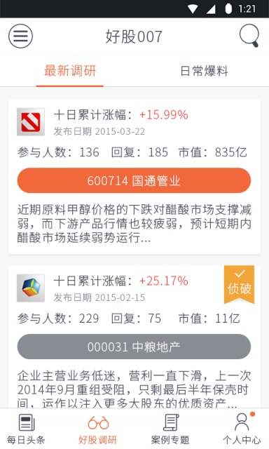 关注并订阅你喜欢的高级探长,发动自己的实地资源,积极参与实地信息反馈,悬赏你希望了解的个股并召唤探长解答,分享共同的研究成果。学会调研技巧,体验研究乐趣,从今天起你也是股市侦探好股007的一员。