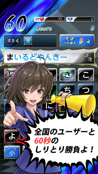 《口先番长VS しりとり格闘》是经典益智游戏《口先番长》系列的最新作品。游戏人物设定和游戏方式都非常的有趣,看上去智商有点残念的筋肉男,有着绝对音感的不良美少女,死神系暴走族,背着日本刀的高中女生,都将在游戏中通过文字接龙的方式来进行战斗。