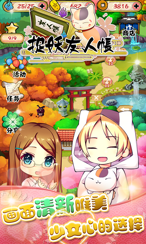 捉妖友人帐是一款根据同名动漫改编的消除闯关手游,游戏有着精美的日系动漫画风,诸多熟悉的人物角色登场,丰富的场景关卡以原创的剧情串联起来,十分有趣。来一起快乐的捉妖吧。