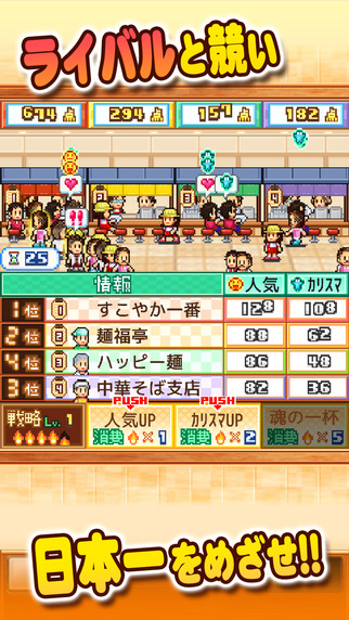 也就是说:参加比赛、制作拉面(面条、汤、成品)—>等级提升—>得到扩大店面的机会—>招募新员工。