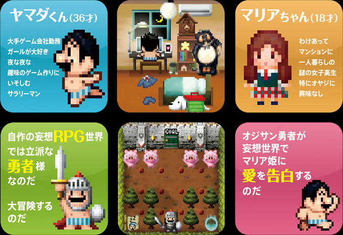 《勇者山田君》由MMV前游戏制作人木村祥朗及怪物设计师仓岛一幸联手打造,两人之前就曾在Wii名作《国王物语》中有过出色表现。游主角是一名对上班有抵触情绪的36岁废柴大叔,女主角是18岁的女高中生玛利亚,玩家要在大叔自制的妄想RPG中进行冒险,最后跟脑补中的“玛利亚公主”终成眷属。