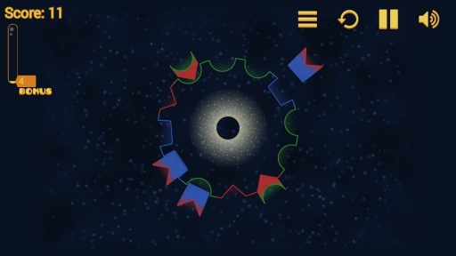 游戏的画面十分简洁,屏幕中央是一颗表面布满各种形状凹槽的行星,在屏幕的四周会不断有不同形状的陨石飞向行星,玩家通过滑动屏幕可以控制行星转动,陨石落在行星上时,会附在行星表面的凹槽上,陨石与行星的每次结合都能得分。