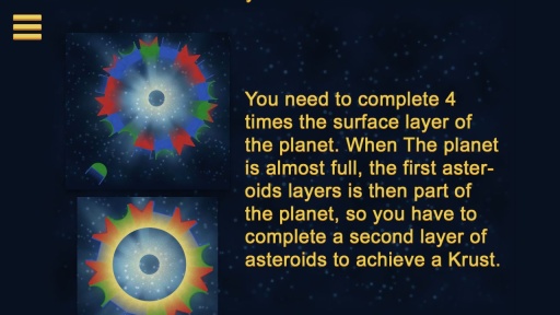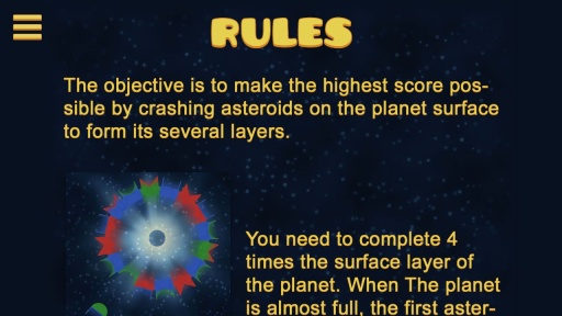 游戏的难点在于下落陨石的形状应该尽量与行星表面的凹槽一致,如果不一致,那么每个凹槽上可以堆叠的陨石数不能超过3个,否则游戏结束,如果连续3个陨石以及行星之间的凹槽都契合,那么3个陨石将会被消除。根据得分,行星共有四个状态,当达到一定的分数时,自动进入下一状态,得分越高,陨石下落的速度也会越快。