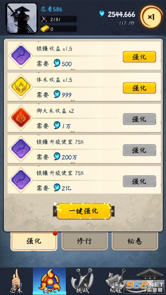 《忍者修炼模拟器游戏》是一款以忍者为题材的竖版放置养成手游,游戏中玩家可以学习体术、御风术、御火术等各种各样的忍术,可以升级强化来提高每个忍术的收益,可以前往各个场景去战斗,还可以打坐修行,获得勾玉等奖励,轻松放置玩耍。