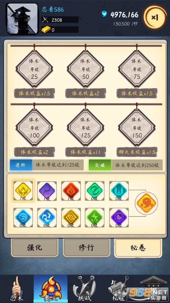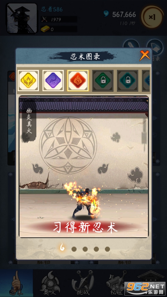 火遁术,水遁术,手里剑,锁镰技,御风术...等多种忍术可供修行。每种忍术可升级,进阶,解锁高等级,高伤害忍术