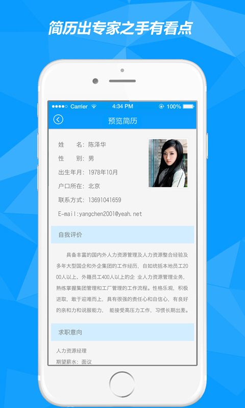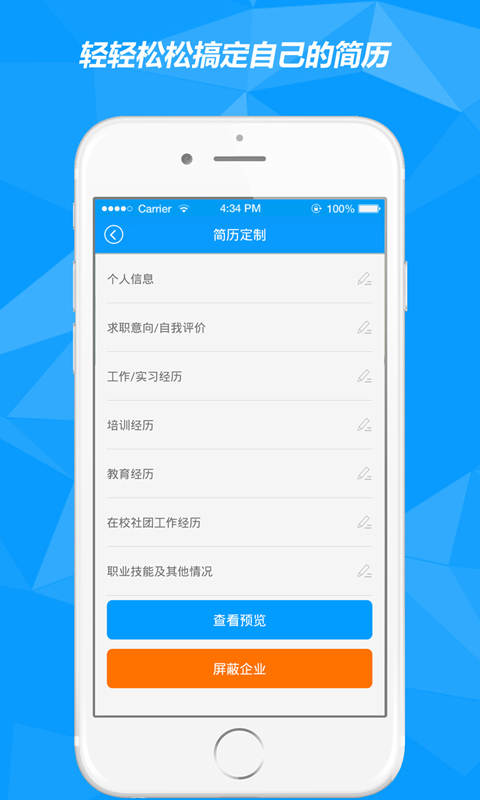 1、简历定制(个人信息、求职意向/自我评价、工作实习/经历、培训经历、教育经历、在校社团工作经历、职业技能及其他情况)