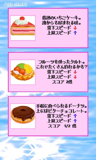 游戏在玩法上非常简单,玩家只要利用不同的鱼饵看准时机就能把东方团子们钓上来了,在时机方面,玩家可以通过观察东方团子的面部表情来判断下饵的时机。移动速度越快的团子得分会越高,不过相应的如果失败了15次以上就游戏结束了。