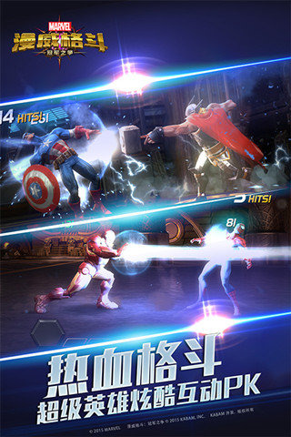 漫威正版授权制作!漫威首款大型格斗网络手游‘漫威格斗:冠军之争’即将发布,游戏采用媲美IMAX大屏幕级别的高清画质和专门为手机用户设计的格斗玩法,力求为玩家营造出美式大片般的震撼体验。豪华的全明星阵容,精彩的必杀技演出,属于每位漫威迷的饕餮盛宴,这个冬天你绝对值得拥有!