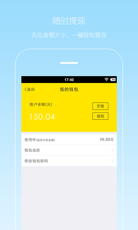 4、赚取外快 用自己的经验特长去帮助别人,还能得到丰厚的悬赏,真正的多劳多得,各种任务等你挑战! 在使用过程中,有疑虑?有建议?想吐槽?