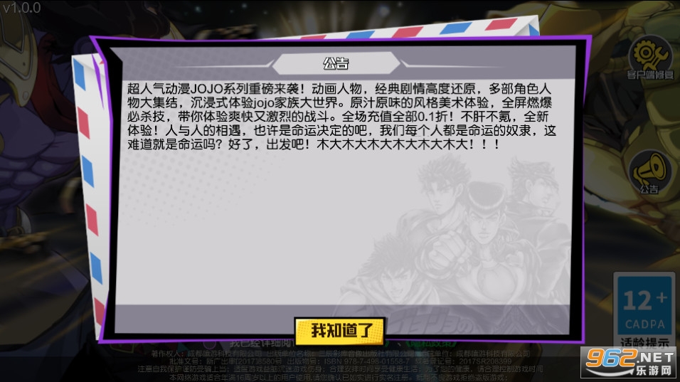 超人气动漫JOJO系列《jojo》重磅来袭!动画人物,经典剧情高度还原,多部角色人物大集结,沉浸式体验jojo家族大世界。原汁原味的风格美术体验,全屏燃爆必杀技,带你体验爽快又激烈的战斗。全场充值全部0.1折!不肝不氪,全新体验!人与人的相遇,也许是命运决定的吧,我们每个人都是命运的奴隶,这难道就是命运吗?好了,出发吧!木大木大木大木大木大木大!!!