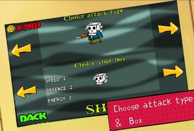 游戏只有三个按键——左右移动和跳跃键,主角会自动攻击,所以我们只需专注于走位,使自己存活的尽可能久即可。游戏中天上会随机出现和你一样头上罩着个纸箱的会飞的裸着上半身的男子,你只需跳到他身边即可进行购物,不得不说这游戏真的很搞笑。游戏还有多种游戏场景和BOSS战在等着你,快跟你的朋友们一争高下吧!