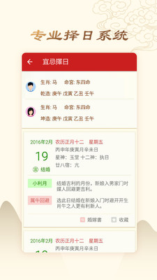 1、专业喜庆择日:选个好日子结婚、开市、旅行,事事顺心!