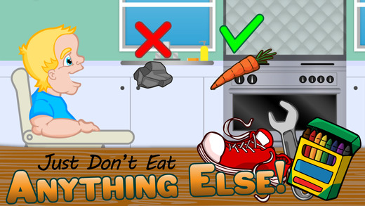 游戏中,有个小孩坐在儿童椅上面,在他嘴巴同一水平线上,会不断有胡萝卜和石头传送过来,玩家只需要在胡萝卜到达嘴边的时候按住屏幕让小孩张嘴,要是石头的话,不操作即可。每一个成功进入嘴巴的胡萝卜和没有进入嘴巴的石头都能算作一分。通过一定的分数解锁其他关卡和角色,在其他角色和关卡中,玩家还要帮助他避开狗、苍蝇、迪斯科、打雷、UFO等的干扰,除石头外还会有珠宝、头发、激光枪等物品。