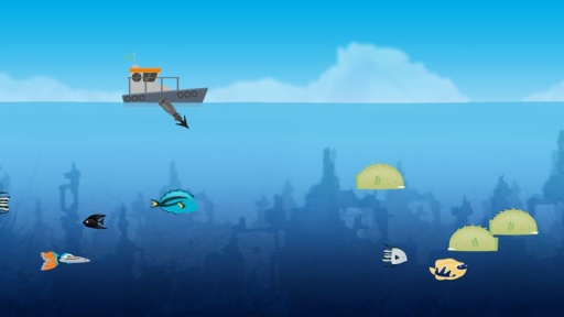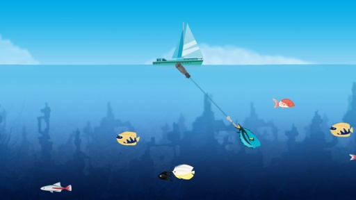 这款休闲手游在海洋的垂直刨面上进行,点击屏幕往处发射鱼叉,通过重力感应驾驶渔船。