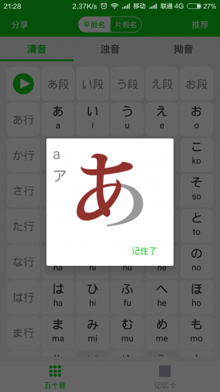 2.支持卡片式记忆法,从此记忆五十音就跟玩一样