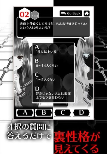 《表里性格诊断》是一款文字剧情类的角色扮演游戏,游戏中,玩家要对一名怪异的少女进行精神鉴定,这可不是什么好活。整个游戏的画面被一分为二,一面正片,一面反片。玩家就要在这一正一反之间,陪一个精神不正常的少女玩耍。听着就够了……