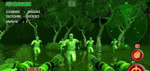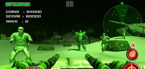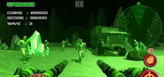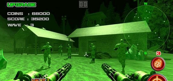 游戏别出心裁的以夜晚为背景,当然也有可能是可以吧画面做的简单点,所以画质的期待值并不高,而玩法是类似抢滩登陆的固定视角,你负责消灭一拨又一拨冲上来的敌人,射击的感觉还是挺爽的。