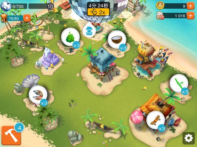 在荒岛上,小黄人们要使用有限的资源建造酒吧,建造舞台,建造乐园,建造各种游乐设施。当各种娱乐设施越来越多之后,玩家除了看他们咿咿呀呀的开心玩耍,还可以亲自在五种小游戏中与小黄人展开互动。另外一个亘古不变的游戏目标是帮他们找到一个新的恶棍首领,游戏中有一座特殊的恶棍岛屿,等待着大家的探索哦。总之呢,一切都按小黄人的习惯和需求来,我们顺便分享其中的快乐!