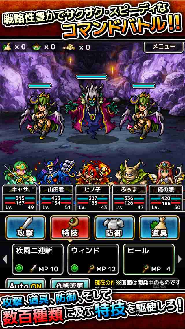 《十字怪物》是一款让你随时进入战斗状态下的动作RPG游戏,游戏中你将面对面的与这些怪兽们对决,想要赢得完全的胜利,你一定要为你的角色进行升级装备。游戏融合TV游戏的本格性和智能手机的方便性!本作是充满策略的爽快速度感的回合制指令战斗和采用育成系统育成属于自己的小队的本格战斗RPG。回合制的指令战斗,只需点击的简单操作,无需选择时间和地点慢慢仔细思考攻略。运用攻击或者技能等等的攻击方法引出队伍的最大极限挑战boss。如果面对杂鱼觉得麻烦,可以选择自动战斗。