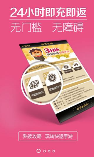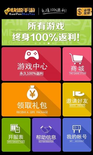 快返手游是一个给玩家提供高额充值返利的手游APP,所有游戏永久100%返利,充值自动返利24小时无障碍,500余款游戏任选,海量礼包一网打尽,是手游玩家的必备神器!