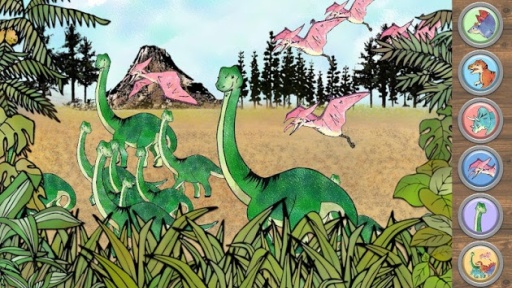 恐龙跟随你的手指,当你触摸屏幕,婴儿恐龙就会跟着父母萌萌哒的一起走出来。