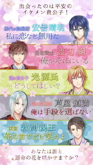 在游戏中玩家将会到日本的平安时代,并且直接面对着毁灭的命运,然后邂逅了著名的阴阳师安倍晴明、武将渡边纲、不可思议的贵族光源氏等历史名人,与他们共同克服难关并且摩擦出爱的火花。
