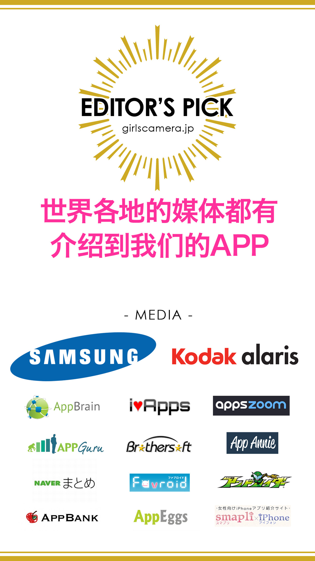 《女孩相机 GirlsCamera》是一个完全免费而简单的图片装饰工具。里头拥有了320种类可爱的邮票,框框,背景刷子和无限颜色的笔让您可以自由的发挥。 当然,您也可以轻松上传到SNS如Facebook,Twitter,Weibo。