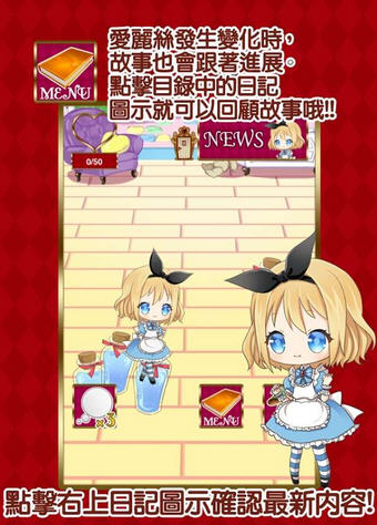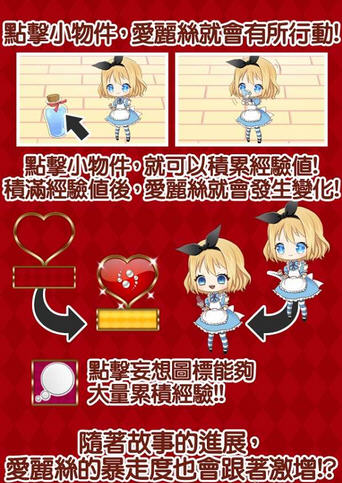 游戏以收集为核心玩法,玩家可以在剧情的发展中收集到不同的爱丽丝,通过查看游戏的图鉴确认爱丽丝的每次变化。另外,通过 SNS 向好友分享爱丽丝的变化,就有机会进入加分关卡。