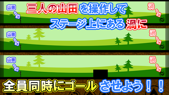 《三个山田(三人の山田)》是一款操作起来难度极高的横版闯关类动作手游,游戏十分的考验玩家的手速,因为你要同时操控三个角色,让他们不断地向前进,前方会有各种障碍在等着你!