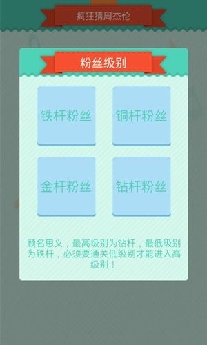 《疯狂猜歌周杰伦版》是一款听歌猜歌名的趣味休闲手游,游戏中收录了大量周杰伦的歌曲,考验你是不是周杰伦的忠实粉丝。游戏有四种级别:铁杆粉丝、铜杆粉丝、金杆粉丝和钻杆粉丝,每个级别都会有数十个关卡,耐玩。