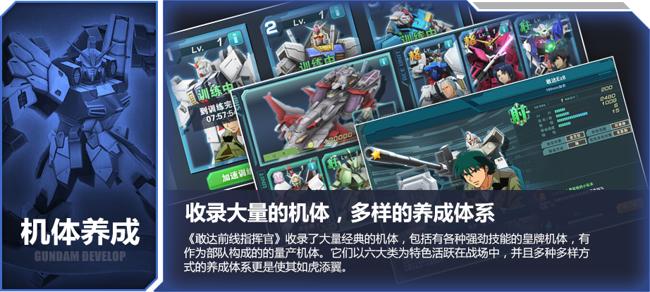 《敢达前线指挥官》收录了敢达全系列的大量经典机体,其中不仅有各个型号的量产型MS,更有战舰和各种拥有强劲技能的皇牌机体。阿姆罗的白色恶魔、夏亚的红色彗星、卡缪的Z-Gundam、基拉·大和的Freedom,横跨多个世界线的ACE都将听命于你,成为你手中的猛将。对于这为数众多的机体,《敢达前线指挥官》有丰富的养成体系,让玩家可以通过养成系统培养自己喜欢的机体,从而提升机体的部分属性,增强自己敢达军团的战斗力。