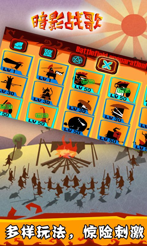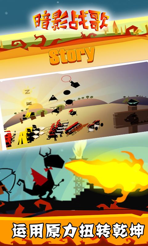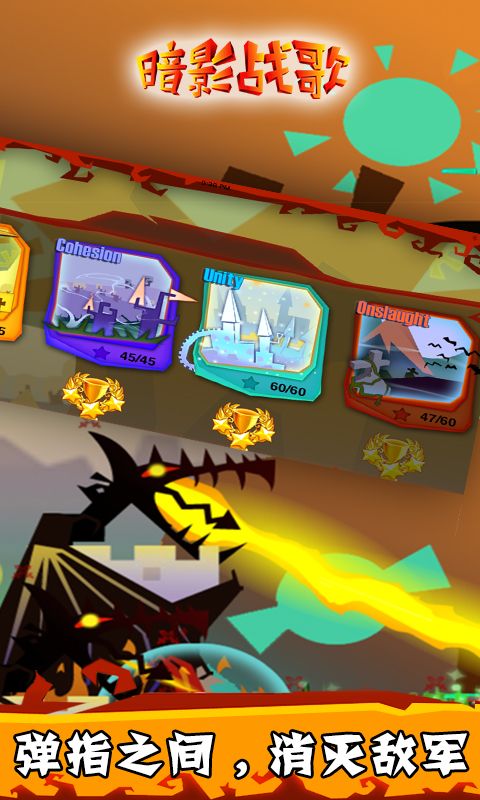 暗影战歌是一款全中文版的动作塔防游戏,不同于传统“跑圈”的塔防游戏,游戏中,玩家只需要手指轻点出勇士,随心勾画“ /、△、□、○、z ”五种图形,就能创造出骁勇善战超强的勇敢战士,斩妖除魔与大脚魔王一决高下!随机调整阵行,打造最强阵容出击;升级兵士获取神力,铸造铜墙铁壁防御;运用不同策略,成就属于自己的剪纸神奇故事。同时游戏的画面采用极具特色的剪纸风格,游戏场景和敌对怪兽的个性表现得淋漓尽致!