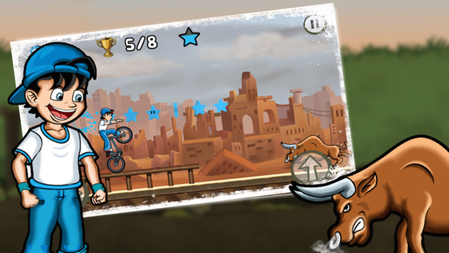 这是一款简单的通过点击屏幕然后让玩家进行跳跃的一款简单游戏,踩着单车冲刺,可以耍杂技,途中可以吃各种东西获得更加高的分数。
