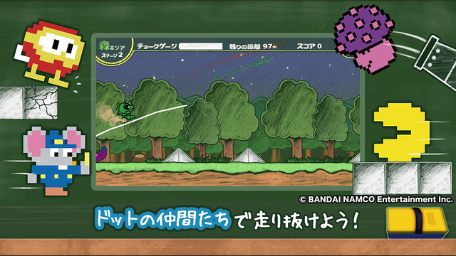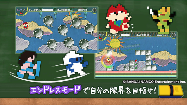 《像素猛冲》该作与它的同社前辈《粉笔冲刺DX》一样,都是万代南梦宫商业IP开放企划下的合作产物。双方同样都属于横版跑酷类游戏,而且《像素猛冲》的画面也沿用了粉笔手绘风,十分独特。