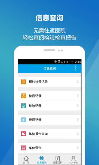 信息查询:患者可以通过客户端轻松查阅自己的检验检查报告单,免去了用户往返医院带来的不便。