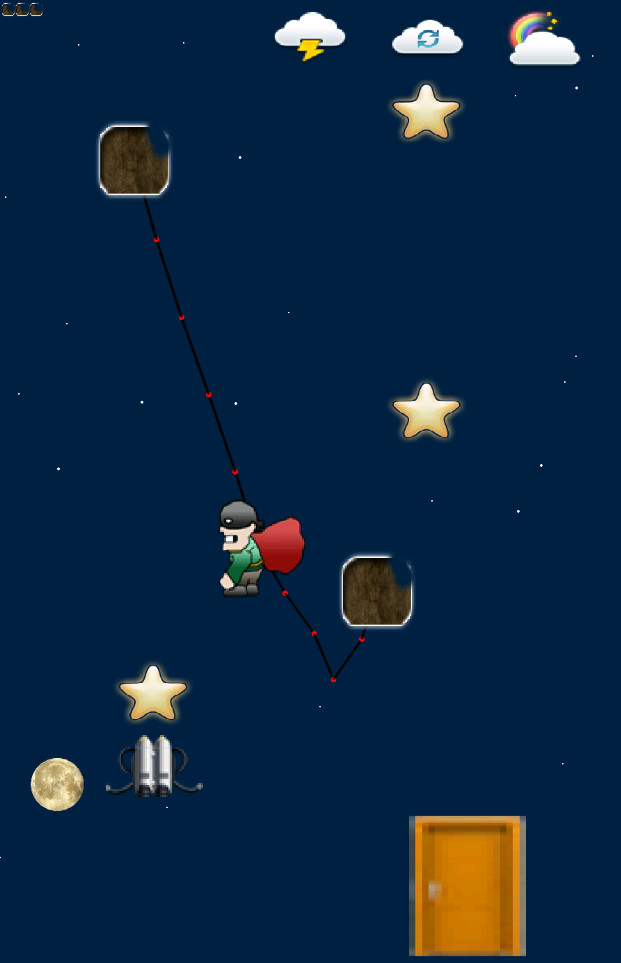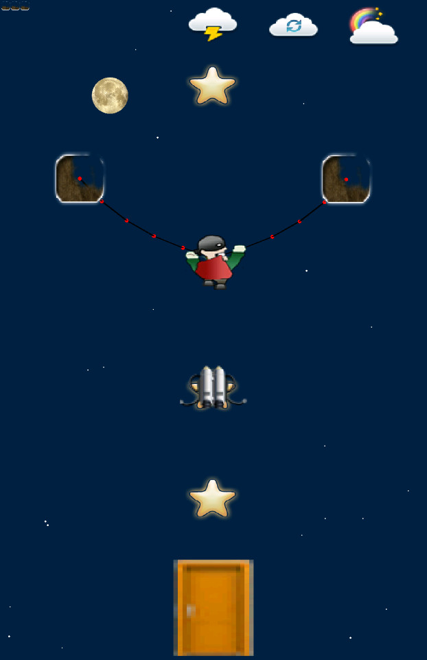 《割绳子蝙蝠人》是一款割绳子的小游戏,游戏画面比较简约,玩法也简单,进入游戏你会看到一个蝙蝠人一根或几根绳子绑着,你要根据实际情况一根根的割断让蝙蝠人在物理的摆动下跳到下面的柱子上。