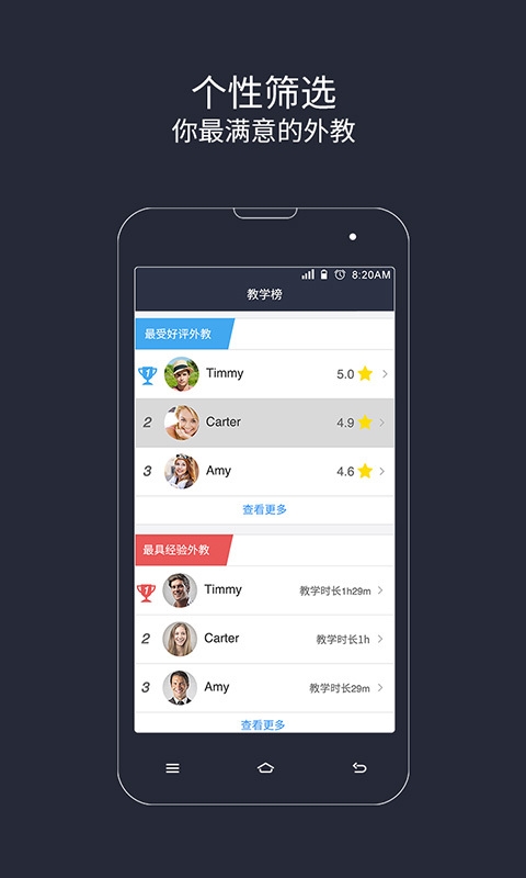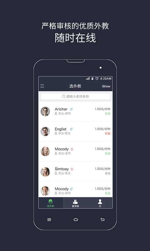 2、个性化筛选:可根据在线状态、性别以及教学经验、人气、好评等筛选出最适合自己的外教。
