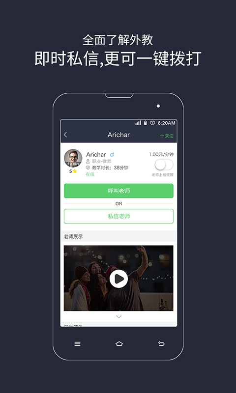 4、实时上线提醒和关注添加:喜欢的外教上线后及时消息推送提醒,并可将中意外教添加至关注列表,方便快速锁定。