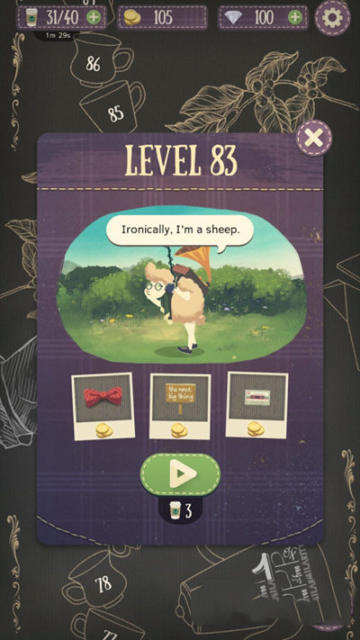 绵羊总是能和“萌”或“治愈”扯上关系,Hipster Maze 《萌羊迷宫》就是一款以呆萌绵羊为主角的休闲益智游戏,一只思想与打扮都有点非主流的绵羊,为寻找心中的理想国,背起留声机勇敢前行,而我们就需要通过拼凑迷宫的方式,帮助它顺利走下去。