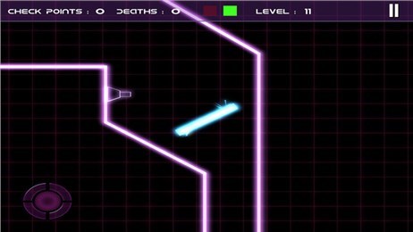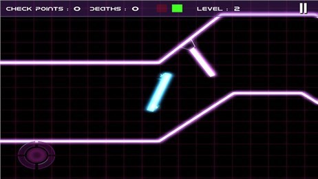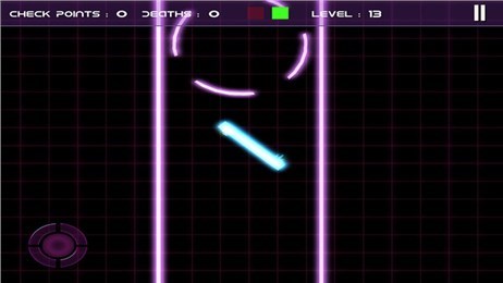 控制旋转的木棍进行移动,玩家们可以根据拖动光标的距离控制发光的几何移动速度,掌握好木棍旋转的节奏进行闯关。