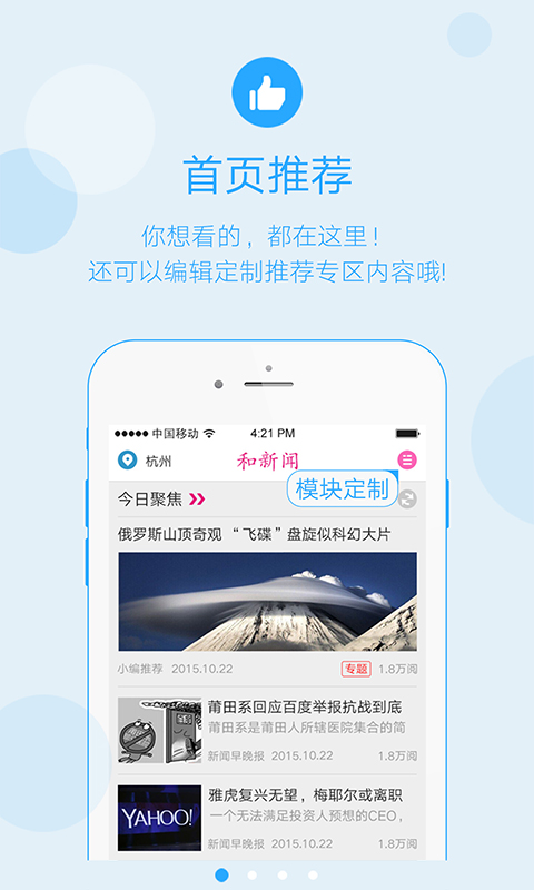 “和新闻”是中国移动为用户精心打造的一款新闻客户端,在这里您可以通过视频、图片、文字等形式了解最新和最热的新闻资讯。 “和新闻”强势来袭!精美的界面,流畅的体验,让你爱上读新闻。