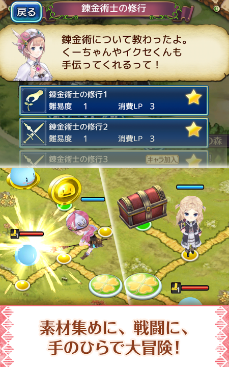 本作将会以桌游+卡牌的形式推出,玩家在本作将可以与工作室系列中的人气角色罗罗娜、斯泰尔格、库迪莉亚一起在棋盘上竞技战斗!熟悉的怪物、武器、道具,收集素材、调和、战斗等系统全部都将完整呈现!还可以根据素材特性利用“炼金术”制作出自己喜欢的道具!